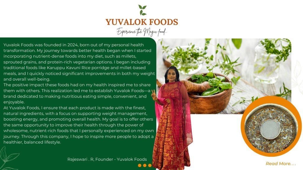 Yuvalok Foods was founded in 2024, born out of my personal health transformation. My journey towards better health began when I started incorporating nutrient-dense foods into my diet, such as millets, sprouted grains, and protein-rich vegetarian options. I began including traditional foods like Karuppu Kavuni Rice porridge and millet-based meals, and I quickly noticed significant improvements in both my weight and overall well-being. The positive impact these foods had on my health inspired me to share them with others. This realization led me to establish Yuvalok Foods—a brand dedicated to making nutritious eating simple, convenient, and enjoyable.At Yuvalok Foods, I ensure that each product is made with the finest, natural ingredients, with a focus on supporting weight management,boosting energy, and promoting overall health. My goal is to offer others the same opportunity to improve their health through the power of wholesome, nutrient-rich foods that I personally experienced on my own journey. Through YUVALOK FOODS, I hope to inspire more people to adopt a healthier, balanced lifestyle.
